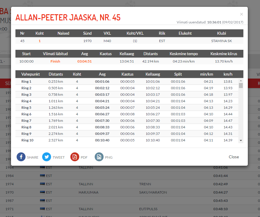 need on nn põhitulemused mis on peale võistlust igatpidi sorditavad, klikkides nimele näeb antud osaleja detailseid tulemusi, vaheajad, kiirused, jne.